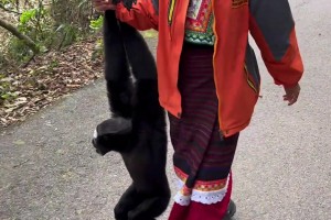 小姐姐在景区摸了下狗狗后 就被狗狗拉着去买火腿肠